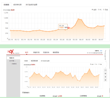 5月20日引入儿童汽车座椅88淘宝店铺的内贸运营项目,由基地老师带队并安排14级卞伟佳、庄琪对接,主要负责平台后台的数据整理,统计和汇报。通过学生的努力与老师的指导,客户店铺的浏览量明显上升,目前该项目已经运营三周。整个内贸项目由从零基础开始到5月30时更是全网排名前十,访客量和成交量成递增式增长,预计下半年成交额可达到2000万。如图: