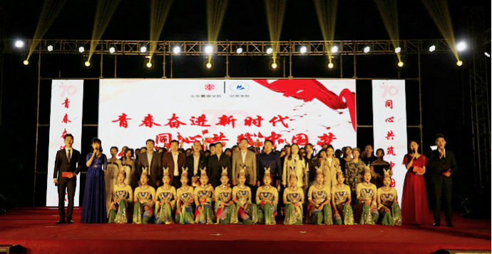 壮丽辉煌七十载,砥砺奋进新时代。为庆祝祖国70华诞,欢迎2019级新生的到来,10月11日晚7时,由经贸学院举办的“青春奋进新时代,同心共筑中国梦”——庆祝新中国成立70周年暨2019迎新文艺晚会在芳华广场盛大开幕,来自五湖四海的经贸新生汇聚一堂,以精彩的视觉盛宴向新中国成立七十周年献礼。山东管理学院党委书记冯庆禄,党委委员、副校长董以涛,党委办公室主任赵耀培,招生就业处处长原兴照,经贸学院党总支书记张连美,经贸学院院长李全海,校团委副书记代建军,经贸学院教师及2019级全体新生观看了本次晚会。
