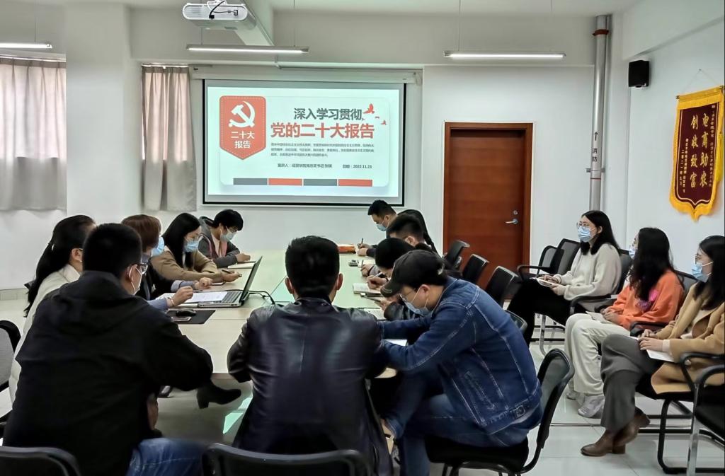 11月23日下午,经贸学院党总支在明德楼203会议室召开学习贯彻党的二十大精神宣讲报告会,党总支书记张琪作专题宣讲,学院班子成员、全体科级干部和系主任参加了学习。