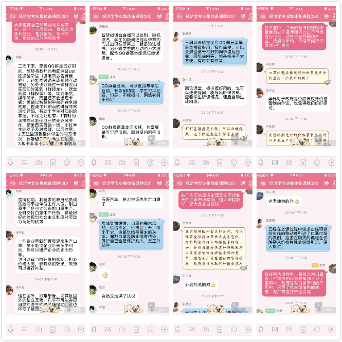 组织线上集体备课活动。经济学教研室的老师们,建立了专业集体备课QQ群,在群里不仅交流各种在线教学工具使用心得,而且对照教学大纲重新设计授课内容,积极探讨琢磨教学案例,巧妙的将疫情期间的社会热点和思政教育融合到在线教学中,不仅教会了学生经济学原理,更是培养了学生心系社会、胸怀家国的情操。