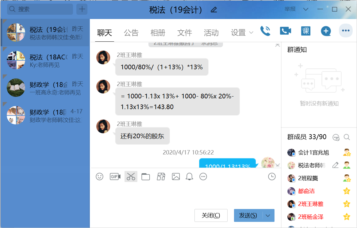网络授课比较传统授课方式有其优势也存在不足,其优势是教学不受时间空间限制,授课过程中对于网络资源的引用更加便利,丰富的网络资源对于扩展学生的学习广度非常有效。其不足在于,必须具备稳定的网络环境,对于网络教学平台有着较高的要求。因此网络授课是一把双刃剑,要充分利用其优势规避其劣势。针对《税法》与《财政学》课程讲授特点,韩老师选取智慧树线上见面课直播作为主要授课手段,以QQ群作为师生沟通的辅助手段进行教学。既充分利用网络教学手段与网上资源库,又针对其网络不稳定性等不足采取相应解决措施。