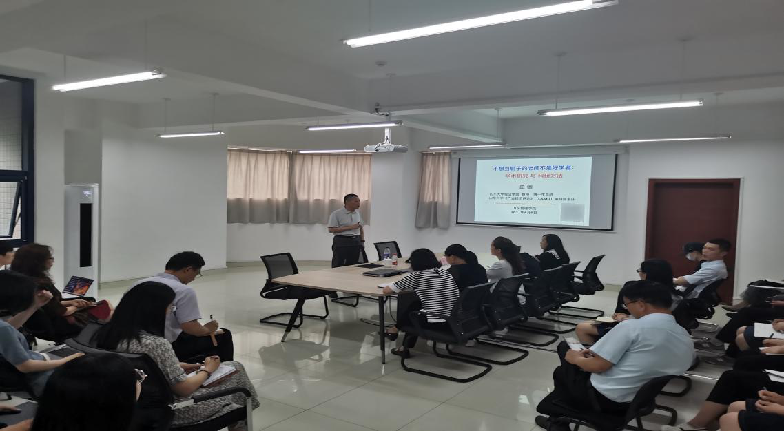 本次会议邀请了山东大学经济学院、山东大学产业经济研究所教授、博士生导师曲创来院分享科研经验。会议阶段,曲创教授首先从论文课题评审的角度,解读学术研究、论文发表和课题申报之间的关系,强调学术研究应坚持长期、稳定的研究方向,研究对象应是真实的客观存在,要从现实中总结、提炼规律来发现学术问题,明确问题在学科大树中的位置。其次专业领域同行之间要加强彼此间的交流,了解专业前沿研究方向。最后,曲创教授从选题范围、规范格式、投稿方式等方面介绍了《产业经济评论》期刊的投稿要求。