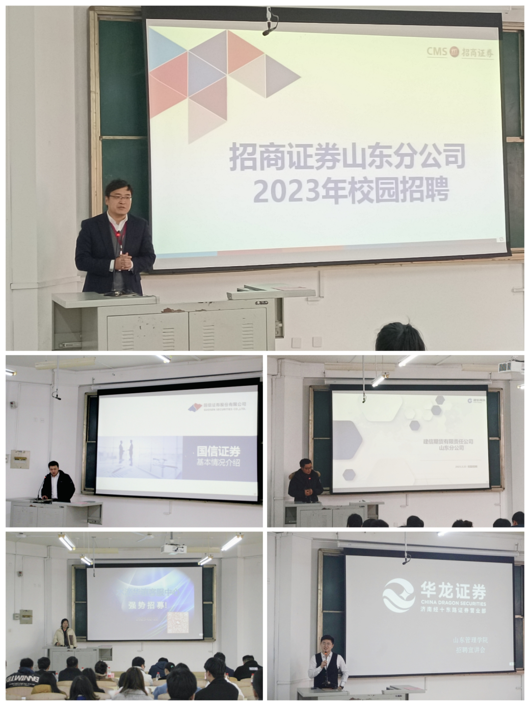 本次招聘会邀请了7家优质企业莅临现场宣讲,包括招商证券股份有限公司,国都证券股份有限公司济南经十路证券营业部,华安证券股份有限公司济南英贤街证券营业部,国信证券山东分公司,建信期货山东分公司,华龙证券股份有限公司济南经十东路营业部,水滴华谊客服中心。