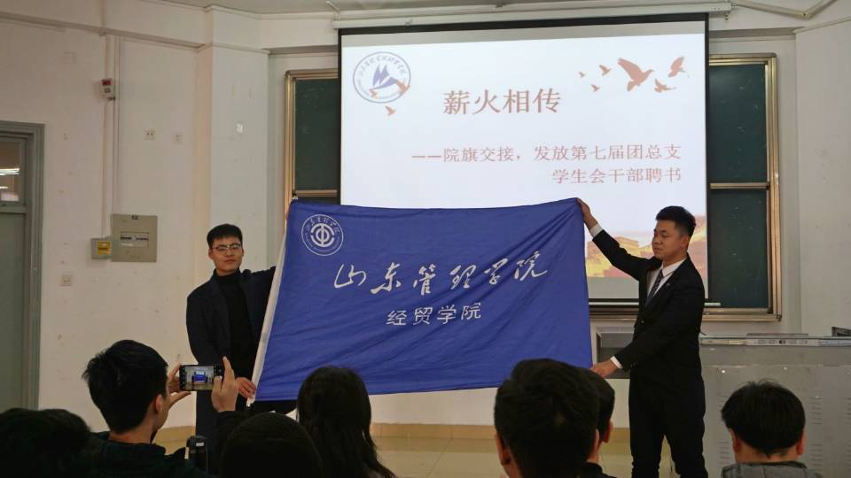 大会伊始,经贸学院第六届团总支学生会主席孟天一上台发言,他希望新一届的团总支学生会能扎扎实实地开展工作,用行动来证明自己的能力,用行动来为经贸添彩。随后,老师们为第六届学生会突出部门和特殊贡献个人颁发证书并由张中正老师宣读第七届团总支学生会干部任命决定。在两届学生会主席交接经贸学院院旗后,第七届团总支学生会主席于宗聖进行就职演讲。最后,经贸学院党总支书记张连美进行讲话,她首先对往届学生会干部们的工作给予了充分肯定,同时对新一届学生会成员的工作提出了新要求、做出了新的展望。最后由学生会主席于宗聖带领第七届学生会干部进行宣誓,表达了坚定工作的信念与不负期望的决心。