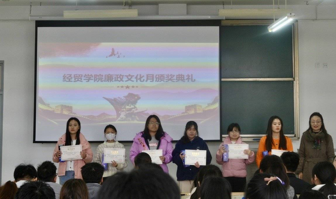 为深入学习贯彻习近平总书记关于党风廉政建设重要讲话精神,营造党风清廉、师风清朗、学风清新、校风清正的政治生态,自2021年11月以来,我院“廉政文化月”活动在全院范围深入开展、扎实推进。12月8日,我院于博学楼C201举行廉政文化月活动颁奖仪式。经贸学院党总支书记张连美、副院长张劲青、学工办副主任张中正、辅导员林媛媛及经贸学院学生参加。