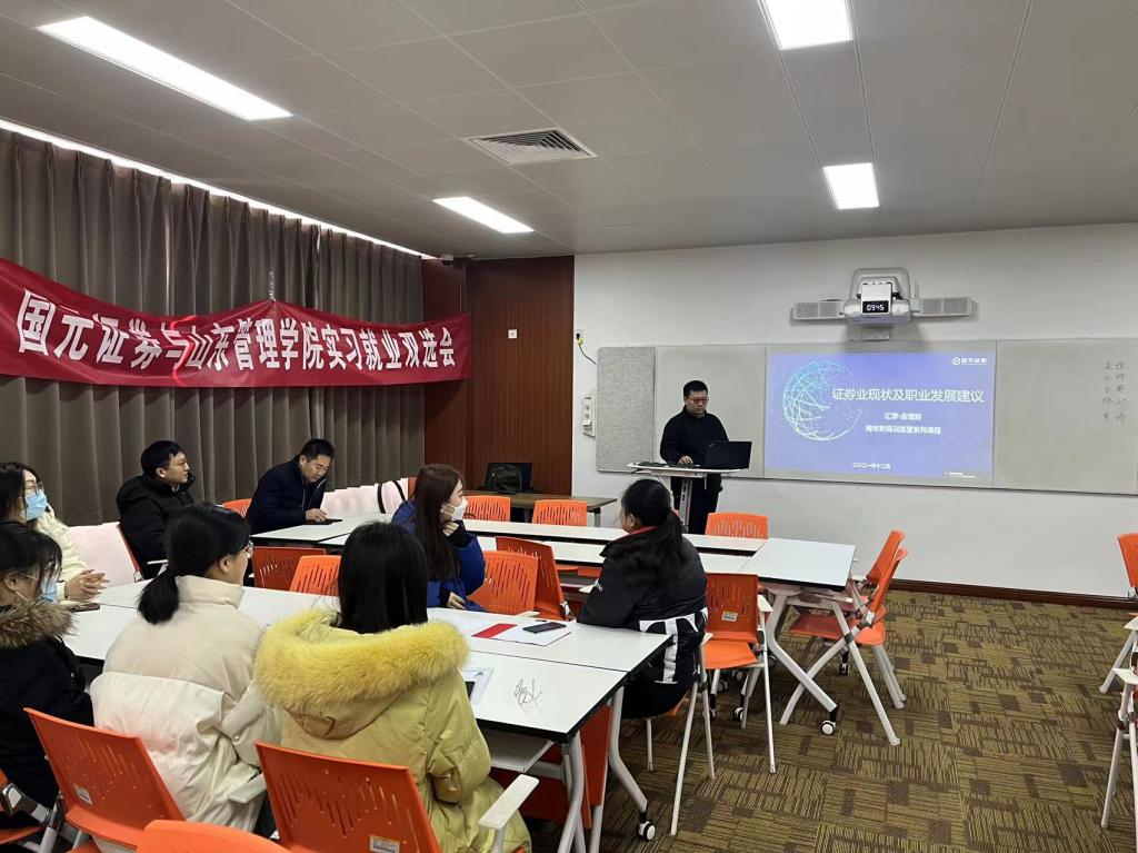 为做好2022届毕业生实习与就业工作,搭建毕业生与用人单位沟通的桥梁,促进我校毕业生充分、高质量就业,山东管理学院于2021年12月28日举办了国元证券有限公司(以下简称国元证券)与山东管理学院实习就业双选会。