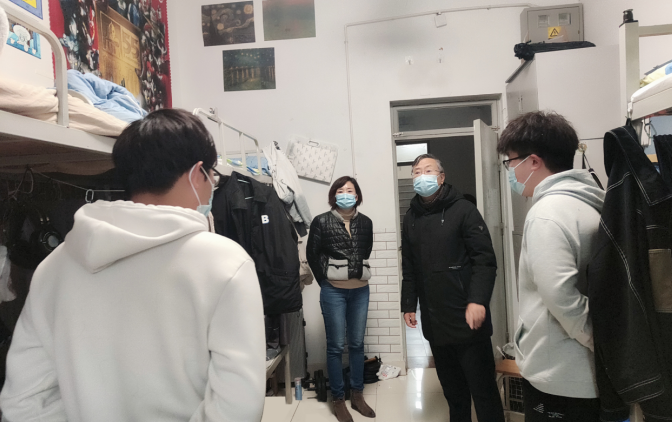 在走访过程中,董以涛与学生们亲切交谈,了解同学们线上学习和宿舍生活情况,并就疫情期间同学们的心态调节、健康饮食和宿舍卫生等方面进行了交流。他向同学们介绍了学校目前疫情防控情况和具体举措,鼓励同学们调整心态,积极适应当前时期的学习生活,并提醒同学们要严格遵守疫情防控期间各项工作要求,优化时间安排,高质量完成线上学习任务,同时做好个人防护、保持宿舍卫生,加强体育锻炼、提高身体素质。同学们纷纷感谢校领导的关心和鼓励,表示定会谨记学校的防疫要求和管理规定,以积极向上的态度对待学习和生活,不辜负师长们的期望。