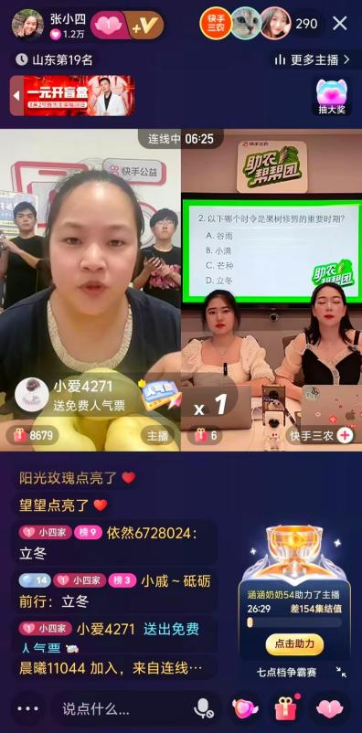 与此同时,团队在快手博主张小四的带领下参与快手公益“助农帮帮团”水果种植互动专场,与快手平台连麦答题、比拼农技,并挑选幸运观众赠送精美农家礼品。此次直播累计观看人数4.9万、最高在线人数3.5万、收获点赞1.6万。