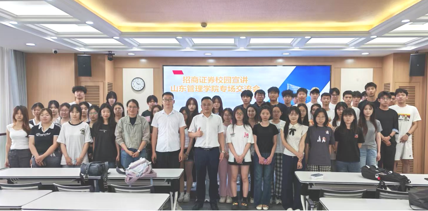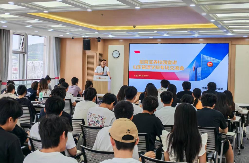 招商证券山东分公司营销总监王智热情接待了全体师生。机构员工带领师生参观了办公场所,播放了招商局、招商证券和招商证券山东分公司的介绍视频。随后开展了座谈交流,详细地为学生们介绍了企业的基本情况、企业文化、运营模式、岗位需求等各方面情况,拓展了学生们的专业视野、提高了专业认知。最后王智总监分别就其从业经历及证券行业的职业规划等内容进行分享。