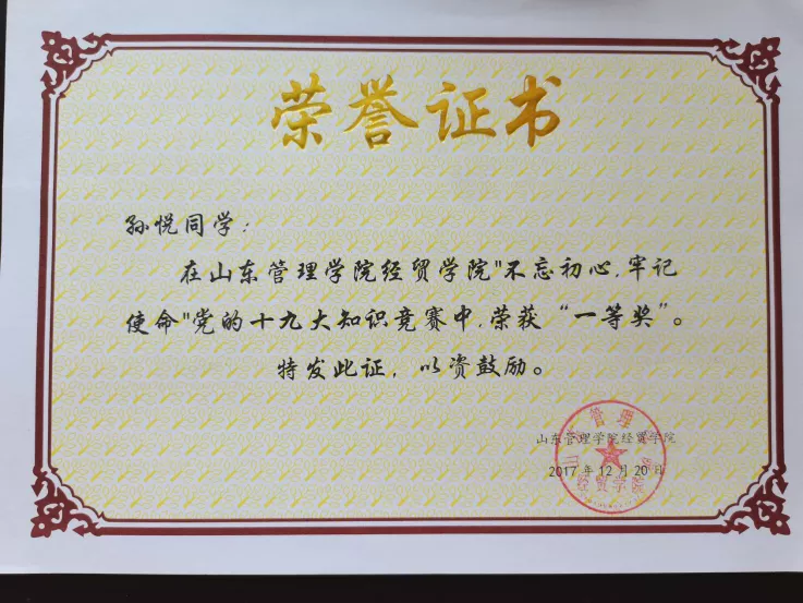 孙悦,中共党员,16级经济学1班学生,考取辽宁大学政治经济学专业研究生,初试分数359,复试分数90.5,专业总排名第五。