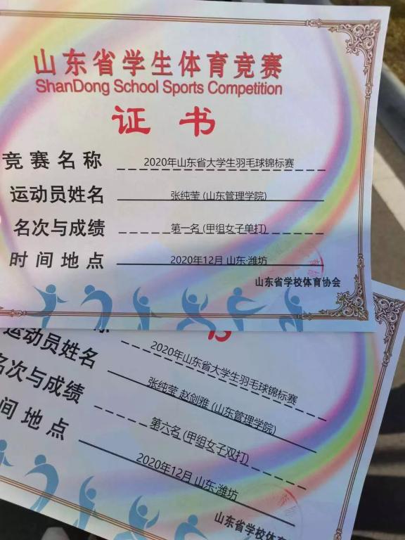 荣获2020年山东省大学生羽毛球锦标赛