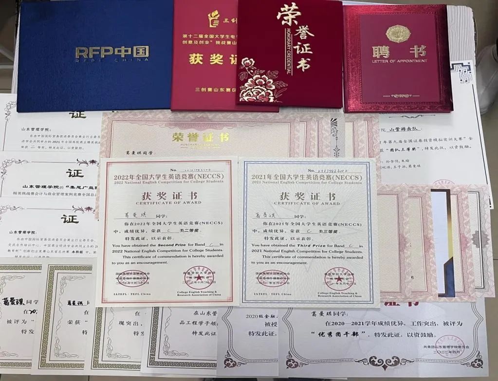 2022年5月 第十二届全国大学生电子商务“创新、创意及创业”挑战赛山东管理学院校赛特等奖2021年10月 第三届全国大学生“典阅杯”互联网金融创新与运营管理大赛三等奖;2021年5月 首届“外教社·词达人杯”全国大学生英语词汇能力大赛山东分赛区山东管理学院赛区三等奖;2020年10月 山东管理学院2020年“黄炎培杯”全国大学生投资理财技能大赛理财业务团队赛优秀奖;2022年 山东管理学院“十佳百优大学生”——明德之星2022年 山东管理学院“朋辈辅导员”2022年 山东管理学院“优秀学生干部”2020-2021学年 山东管理学院二等奖学金2022年 山东管理学院“优秀共青团干部”2022年 山东管理学院第四期“青马工程”优秀学员2021年4月 山东管理学院2021年春季运动会女子组400米第七名;2020年9月 2020级新生军训“训练标兵”。2021年 山东管理学院“优秀学生”2021年 山东管理学院“优秀团干部”
