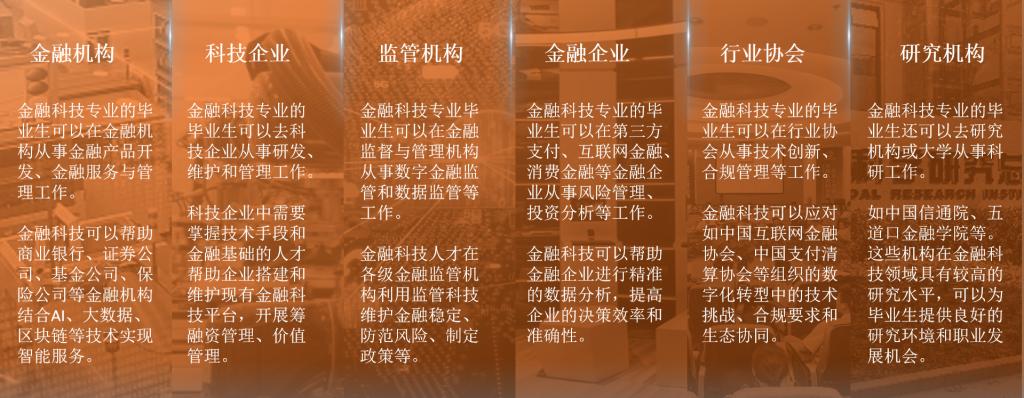 金融科技专业的毕业生可以选择在多个领域就业,就业范围广泛,如金融机构、科技企业、监管机构、金融企业、行业协会和研究机构等。毕业生可以利用所学的知识和技能,为这些领域带来更高效、更智能的金融解决方案。